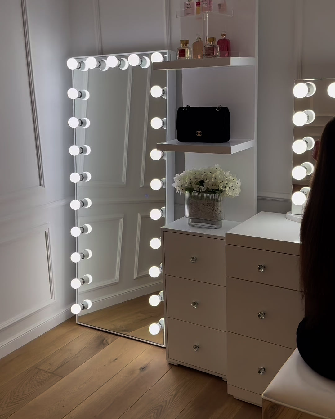 Skab den ultimative beauty space med Vanity Station Chic. Med et Hollywood-spejl med tre lysindstillinger og dæmpbart lys, alt sammen med et enkelt tryk touch button. Det mirrored vanity bordet har syv skuffer til opbevaring af alle dine beauty produkter og meget mere. En investering i din beauty routine i mange år fremover.