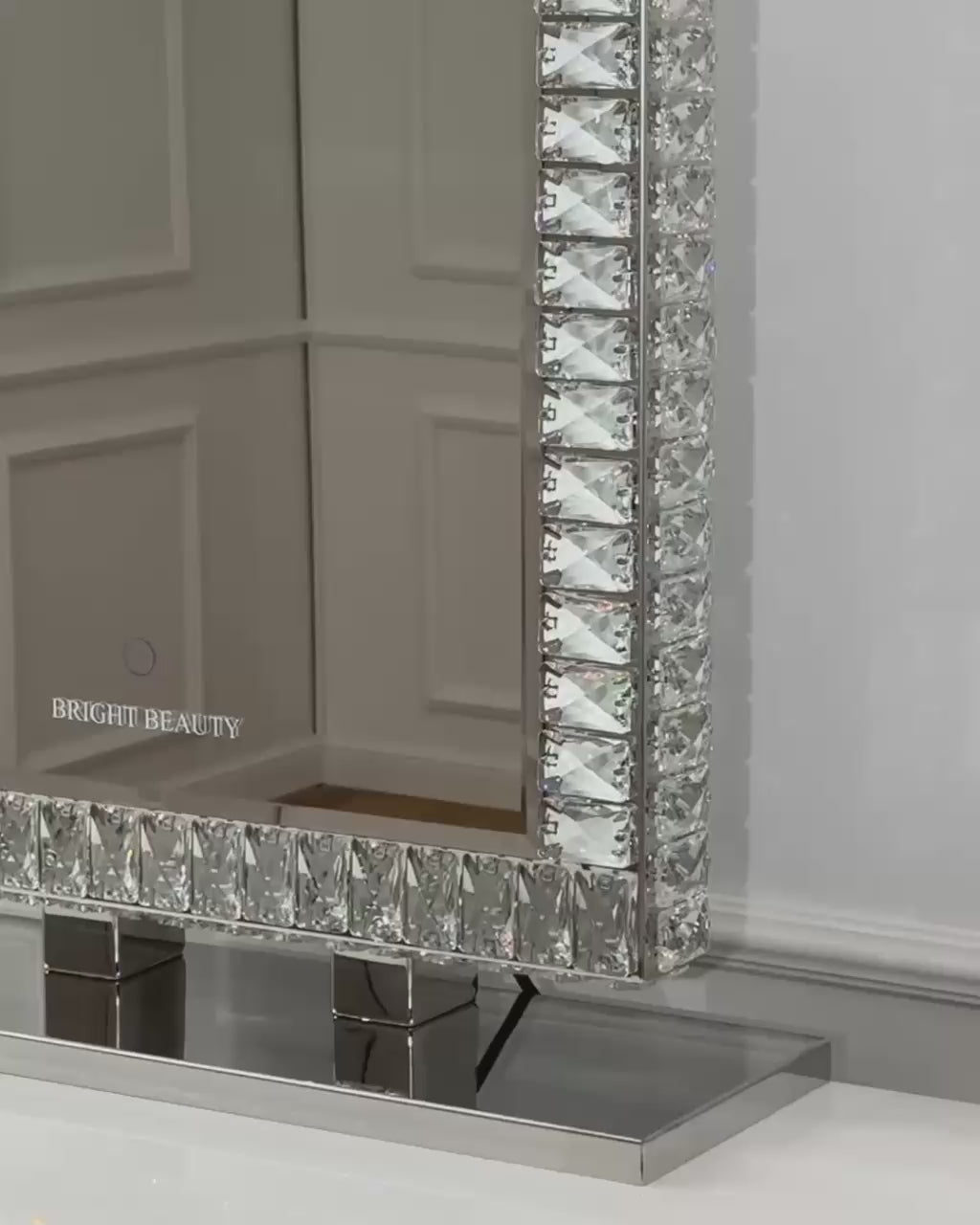 Le miroir rectangulaire Yasmin offre un nouveau type de luxe. Associant des cristaux rectangulaires à un métal parfaitement poli, il s'agit d'un miroir ultra glamour mais intemporel, qui constitue le complément idéal de tout espace de beauté. Il est doté de trois modes d'éclairage et d'un variateur de lumière.