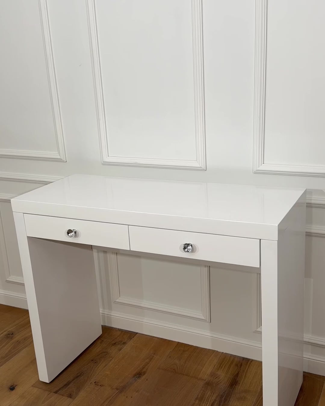 Complétez votre espace beauté avec notre Dressing Table Iconic blanche semi-brillante avec Namira miroir.. Design et fonctionnalité se mêlent harmonieusement dans les deux tiroirs dotés d'un bouton en diamant qui accueillent vos essentiels du quotidien. Cette commode à deux tiroirs est équipé de notre miroir Namira.