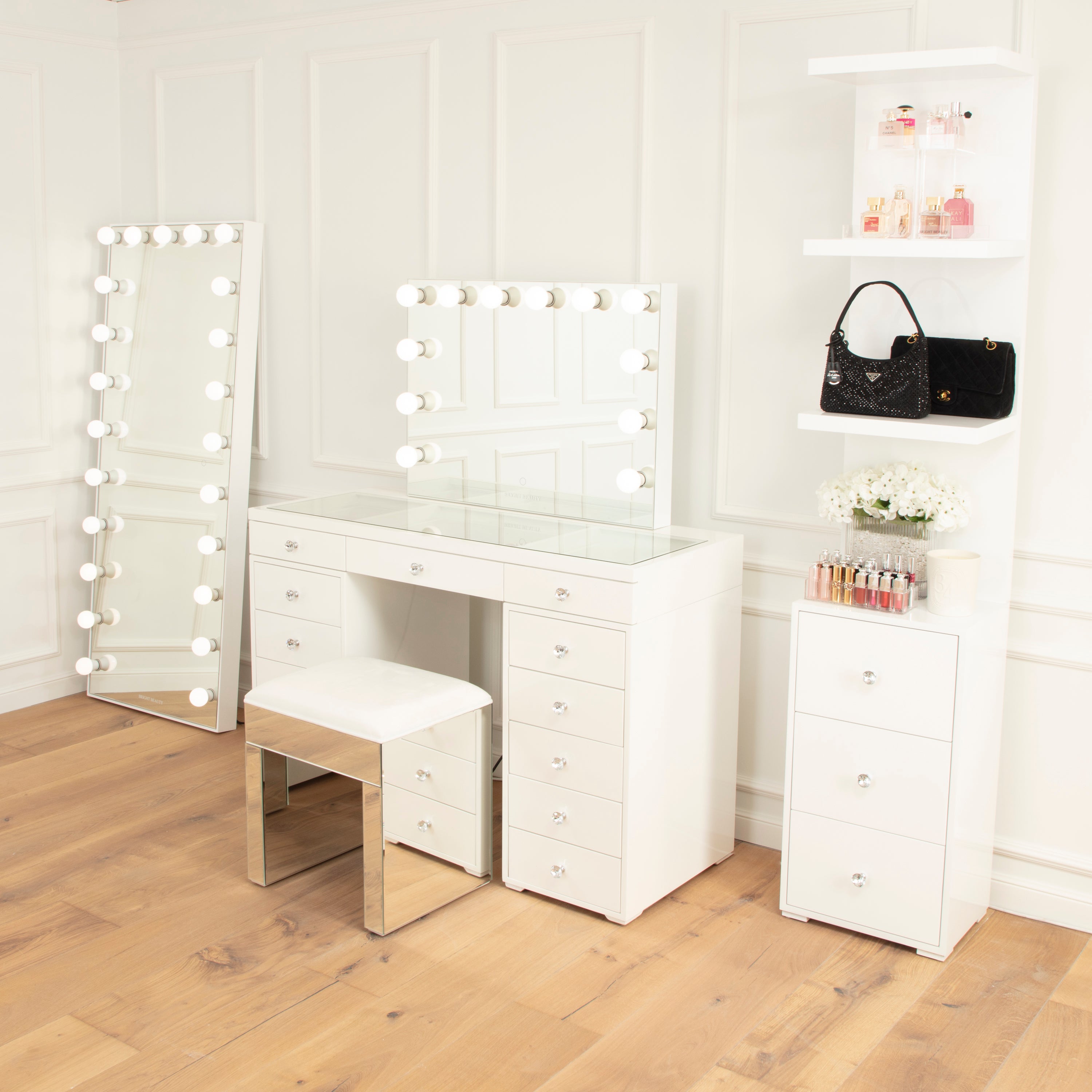 Born out of a deep love for beauty in 2019, Bright Beauty stands on absolute self care supported by premium mirrors and vanities. Immerse yourself in a moment of ultimate self love each day while getting through your make-up and hair routine, upheld with the best lightning and easiest acces to your everyday essentials. Create your ultimate glam space to retreat to any time you need a moment of self love and care.