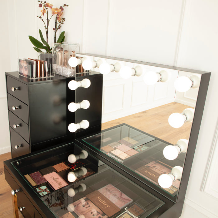 Creëer de ultieme glam space met de Vanity Station Classic. Al meer dan vier jaar één van onze meest geliefde kaptafels. Deze witte semi glanzende tafel heeft een glazen tafelblad om je favoriete items te etaleren en twee sets lades. Deze tafel is groot genoeg om je dagelijkse essentials en nog veel meer in op te bergen. Voorzien van een Hollywood spiegel met drie lichtstanden en dimbaar licht. Een investering in je beauty routine voor jaren.