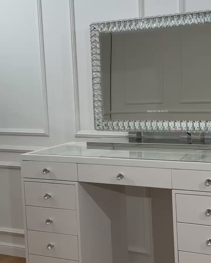 Complete your beauty space with the combination of the Classic vanity table and the Leila mirror. The timeless vanity table with its glass tabletop and spacious drawers offers plenty of style and storage. The glamorous Leila mirror, featuring rectangular crystals, polished metal and three dimmable light settings, provides the perfect lighting. Together, they create a luxurious and elegant addition to any beauty space.